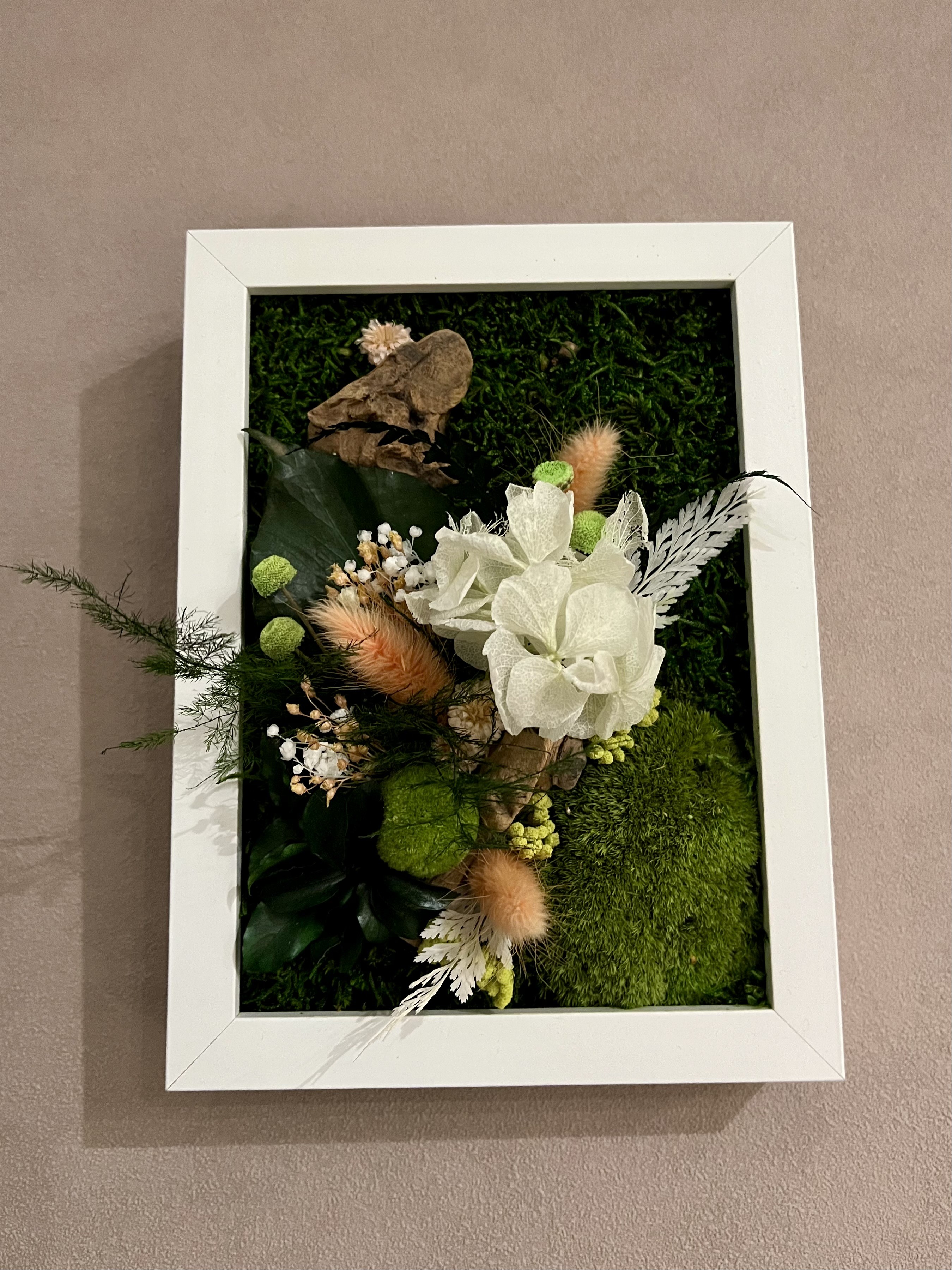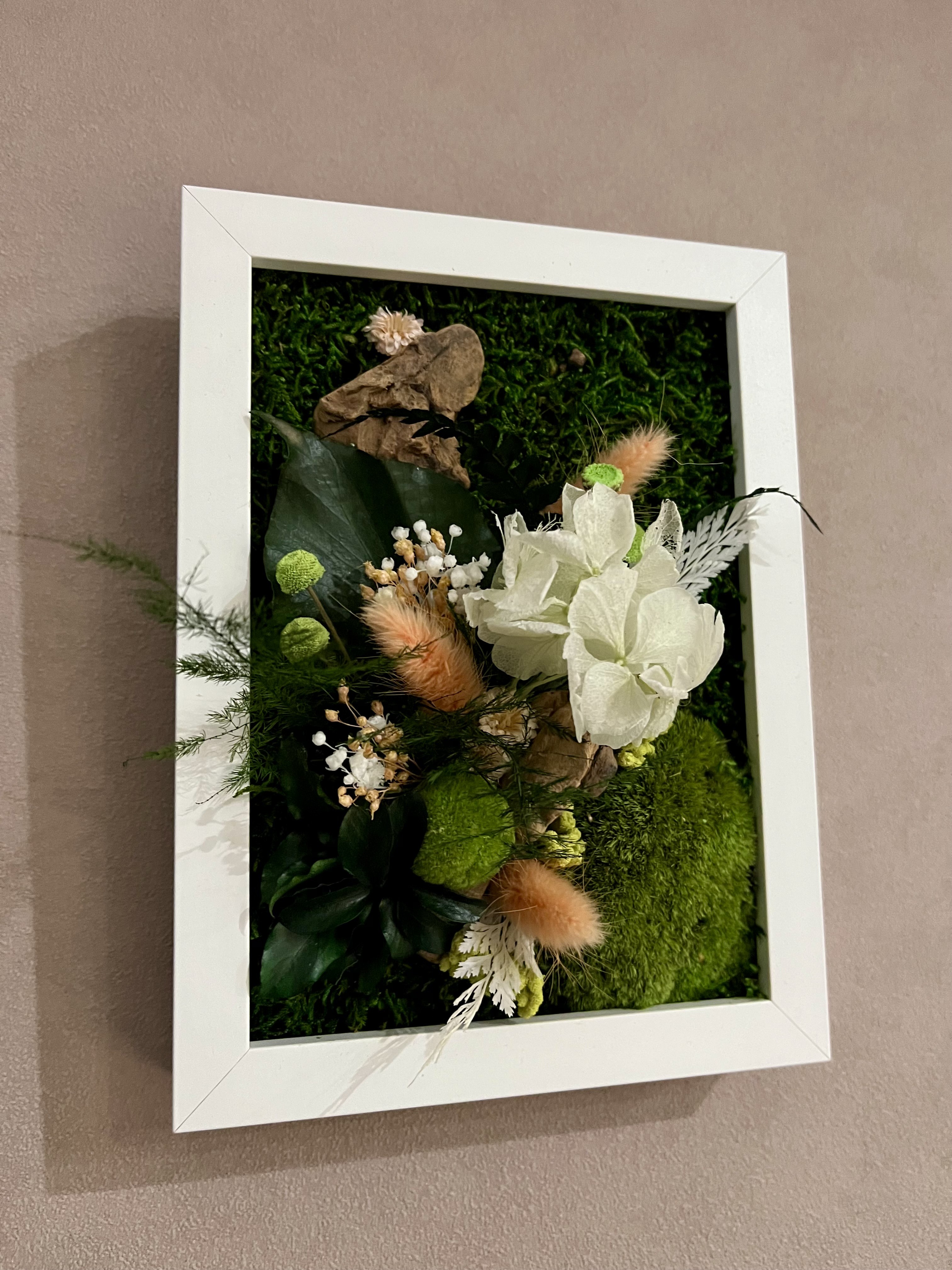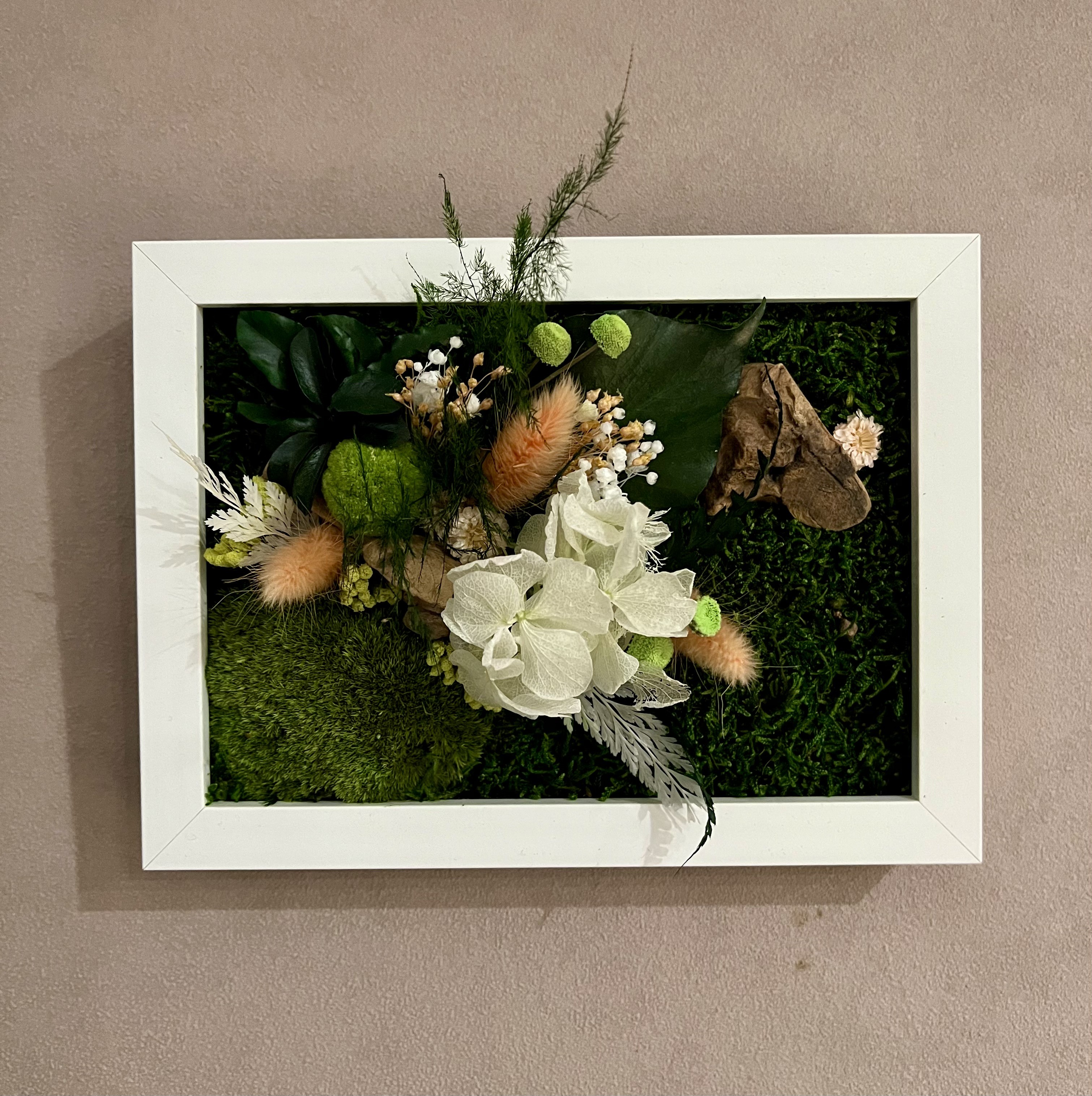 Ce tableau ne nécessite aucun entretien et surtout pas d’eau , car ce sont de vrai plantes stabilisées.