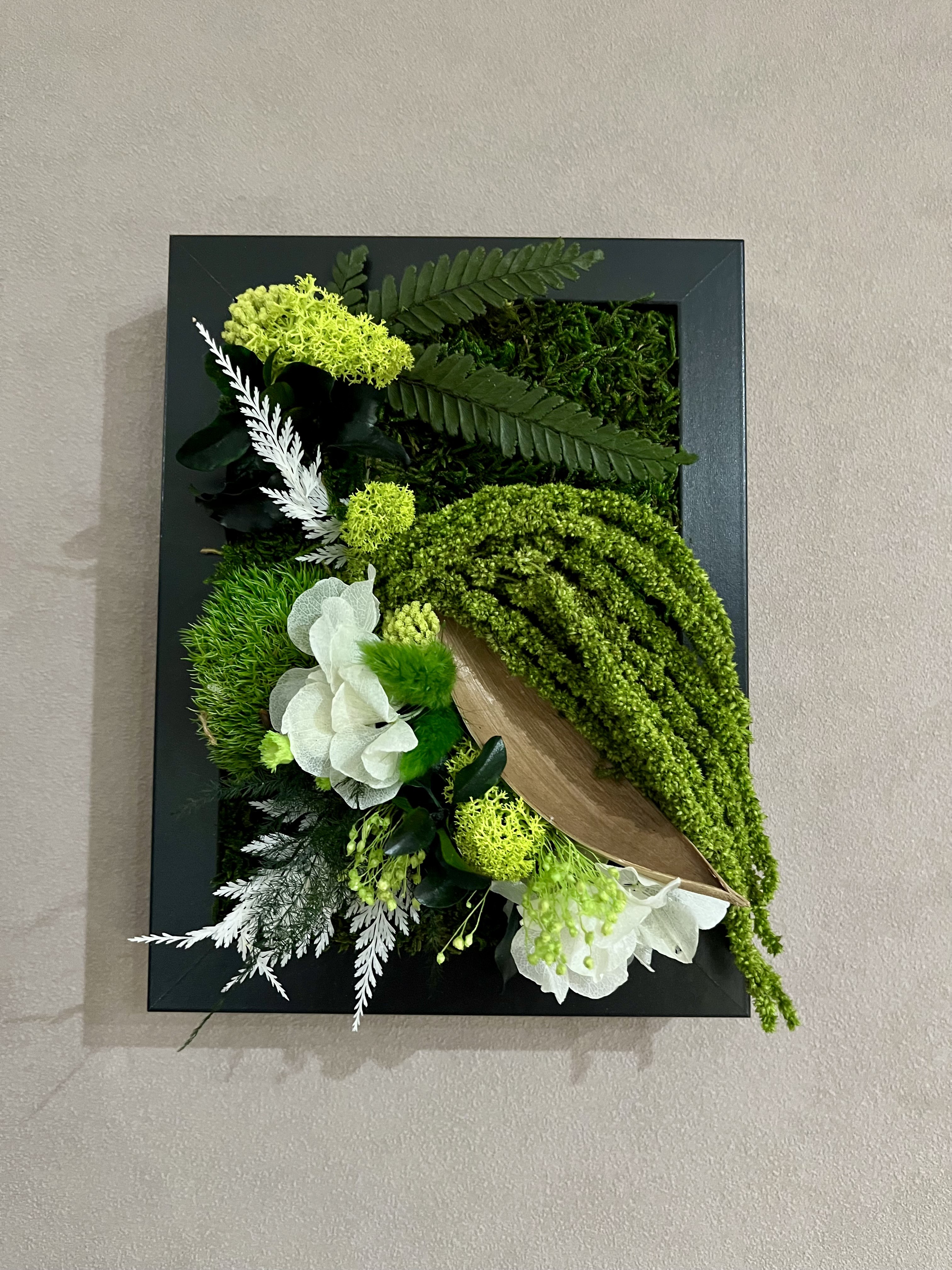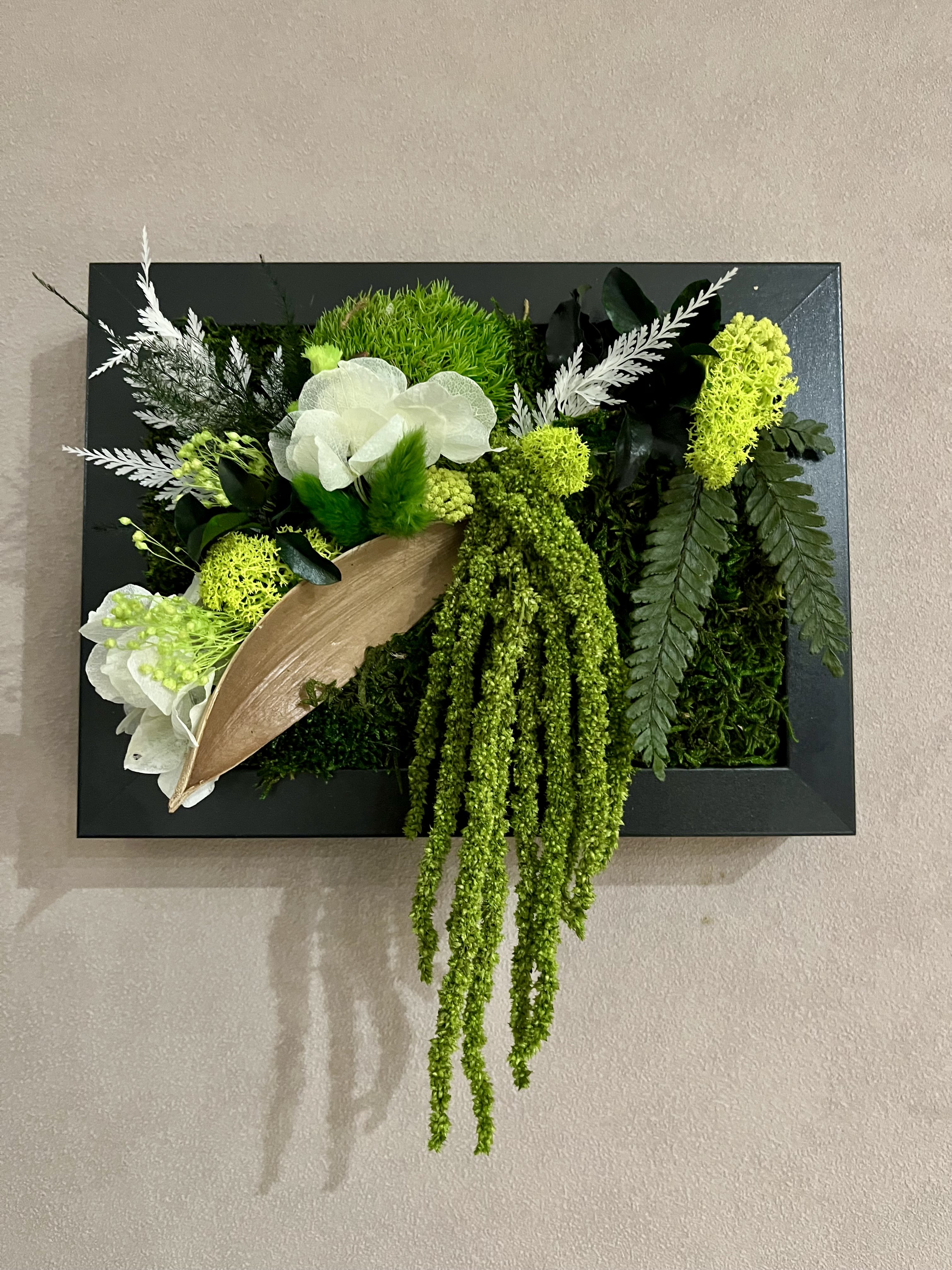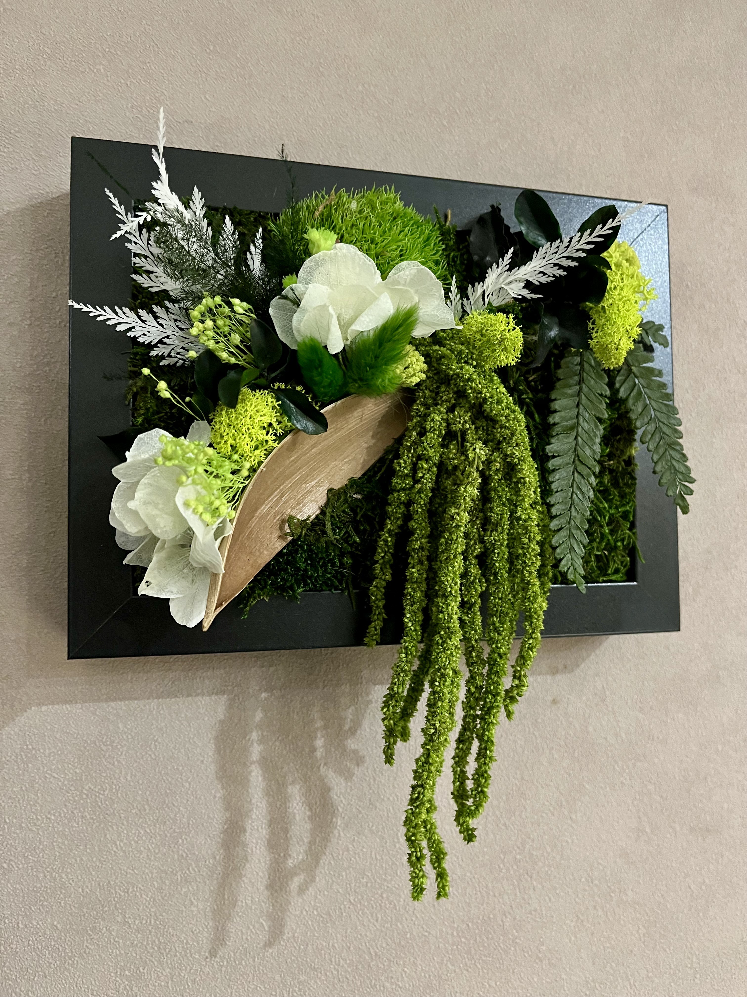 Ce tableau ne nécessite aucun entretien et surtout pas d’eau , car ce sont de vrai plantes stabilisées.
