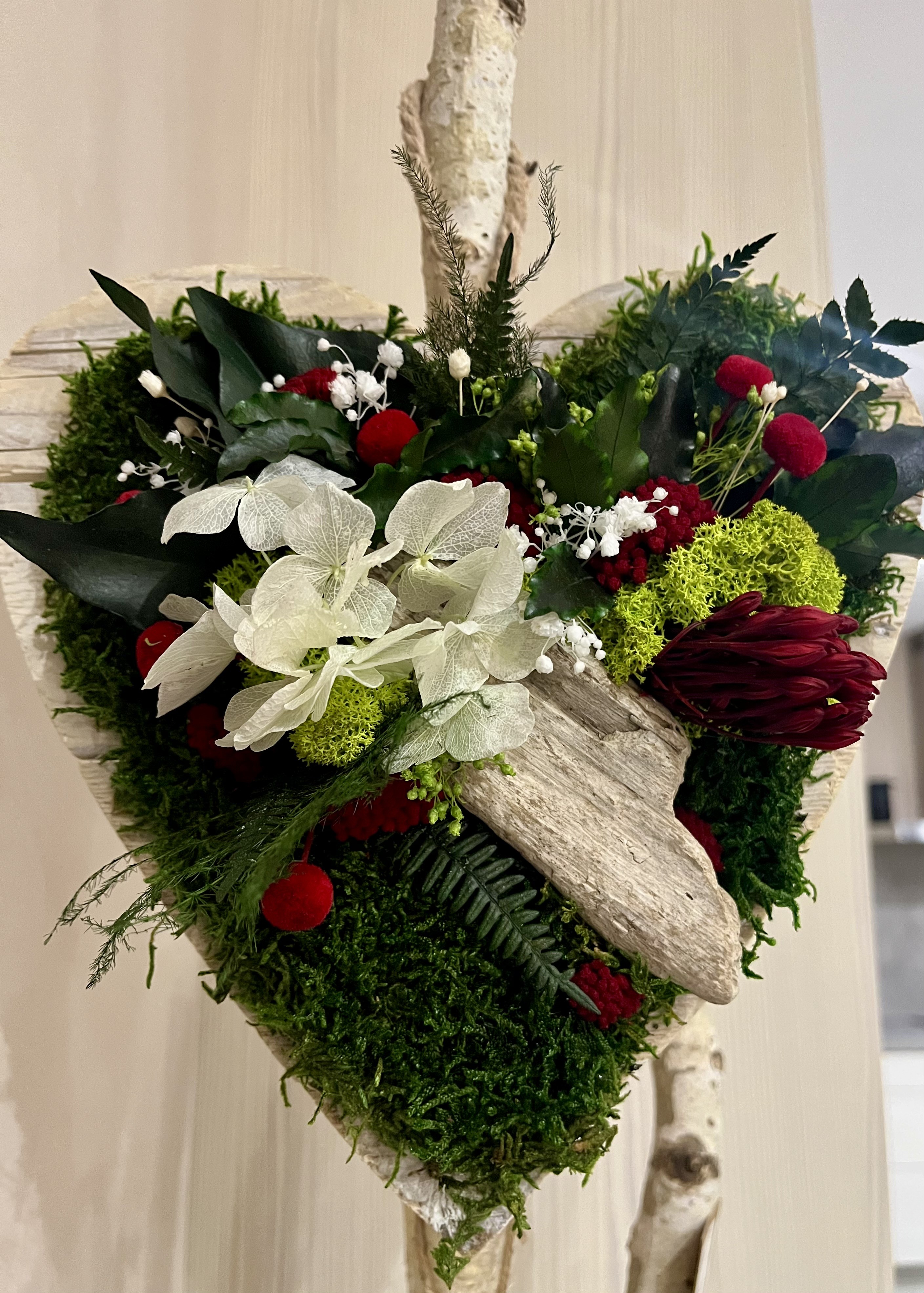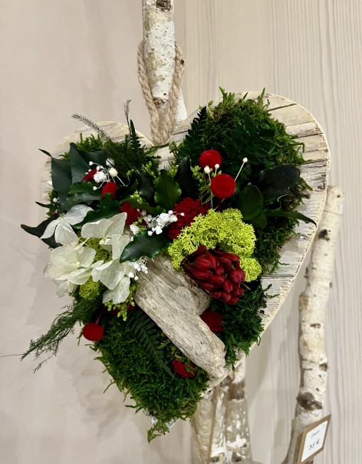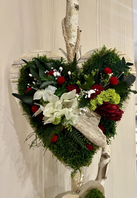 Cœur stabilisé en bois à accrocher avec de vrai plantes stabilisé et une rose éternelle.