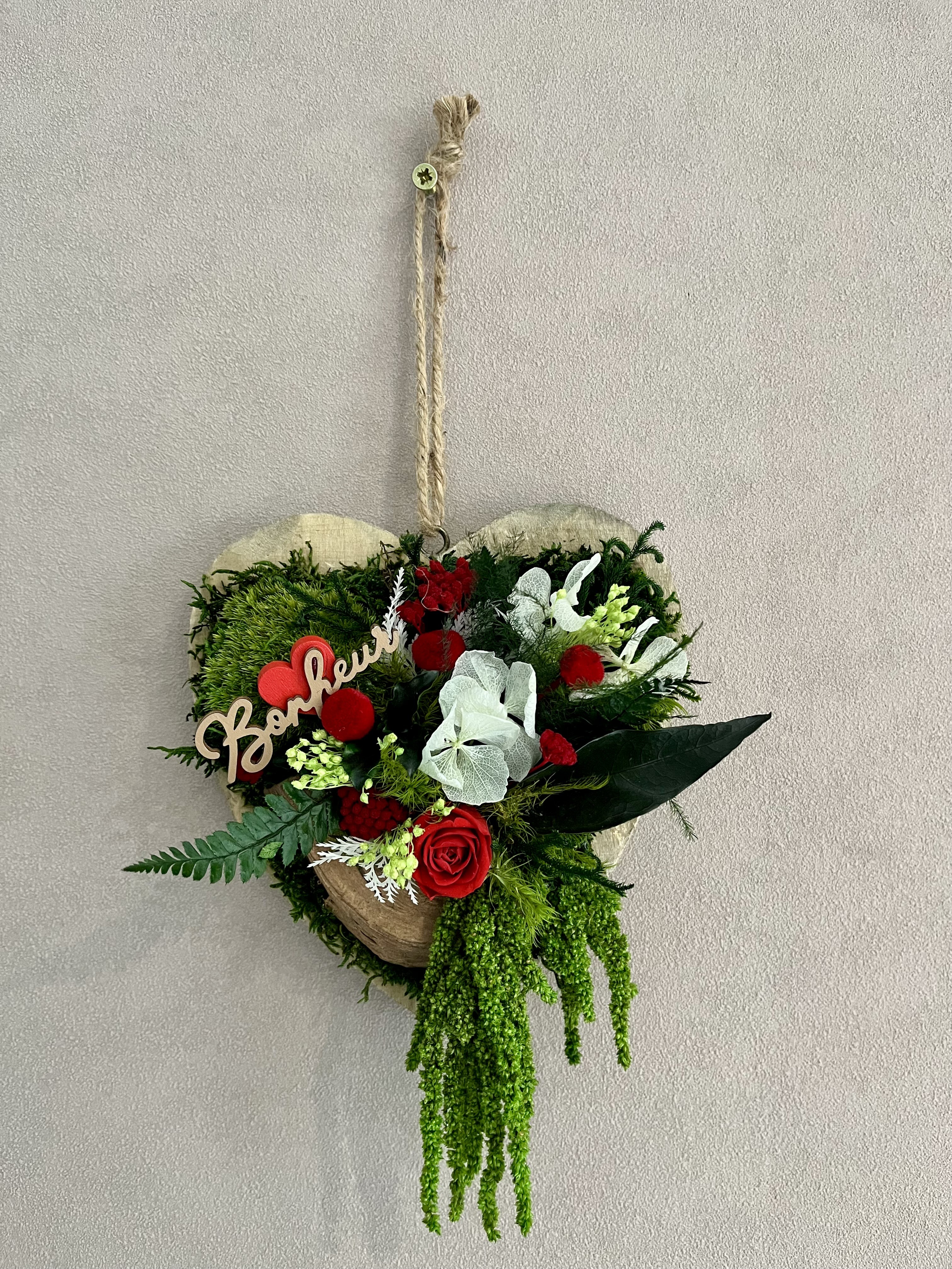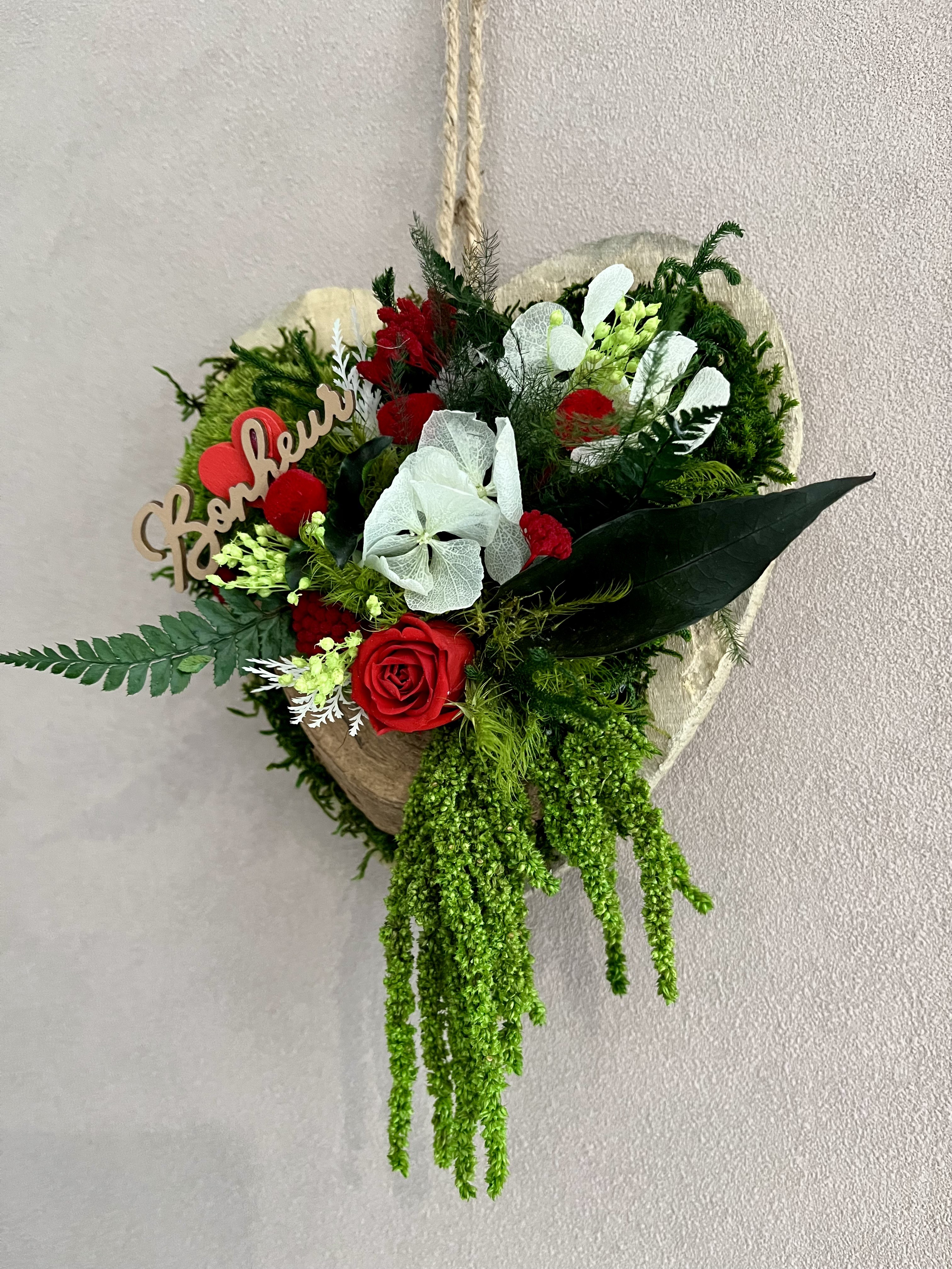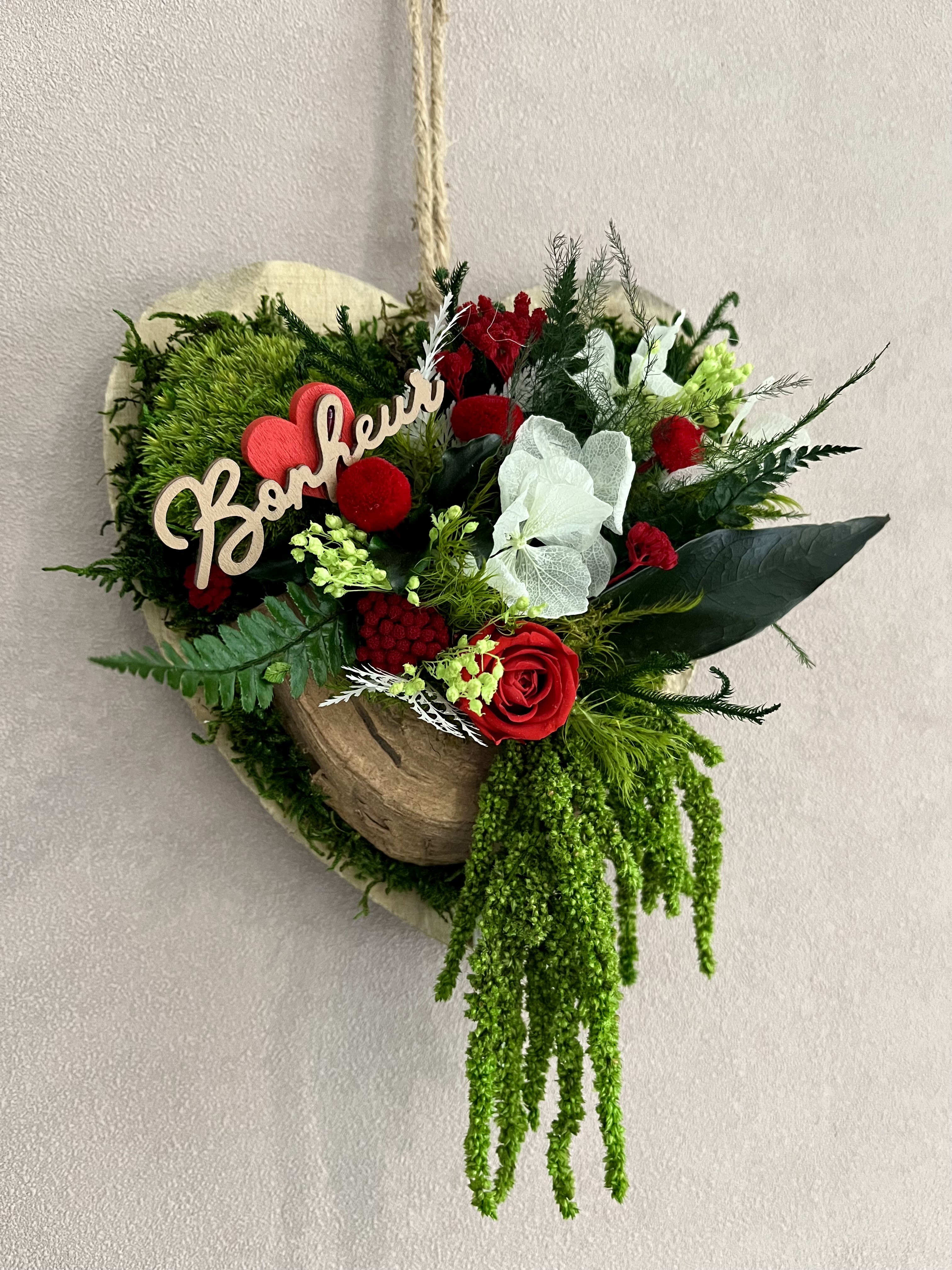 Cœur stabilisé en bois à accrocher avec de vrai plantes stabilisé et une rose éternelle.