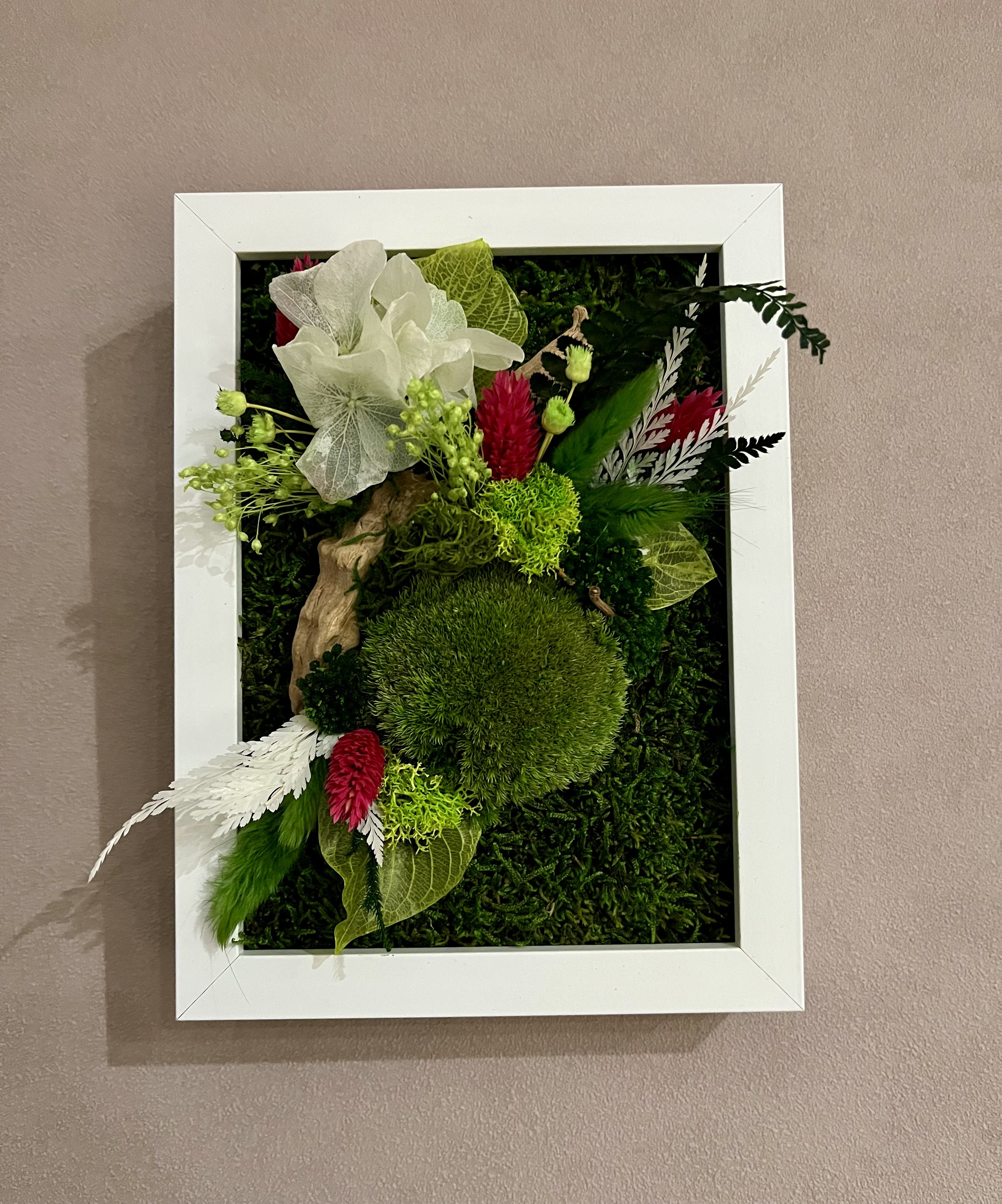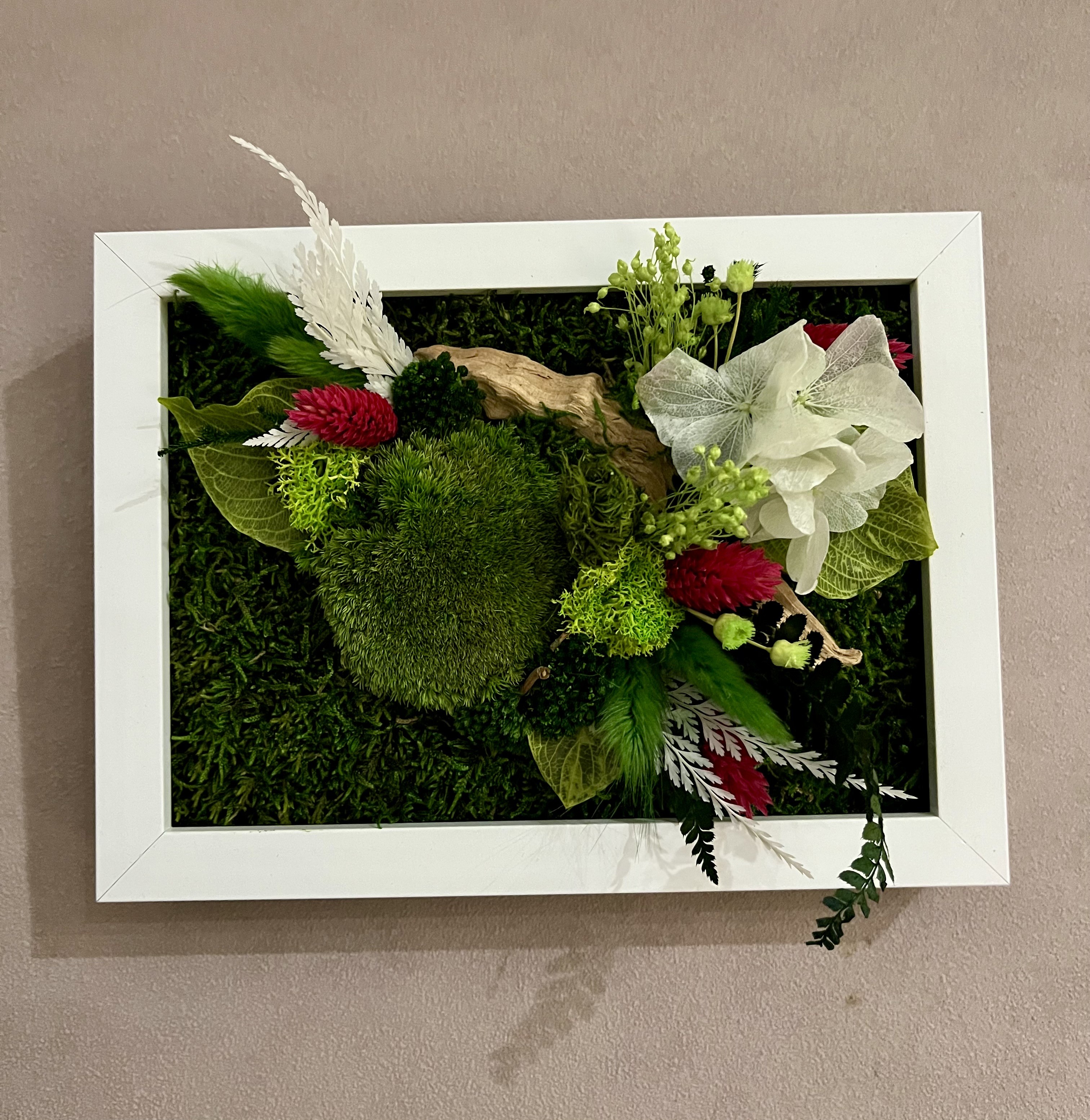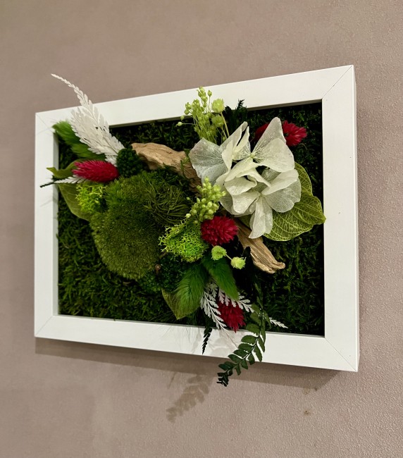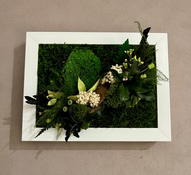 Ce tableau ne nécessite aucun entretien et surtout pas d’eau , car ce sont de vrai plantes stabilisées.